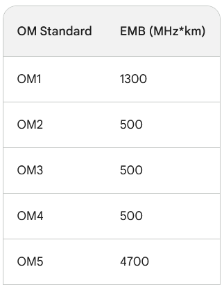 Table comparing the Effective Modal Bandwidth of Multimode cable types.