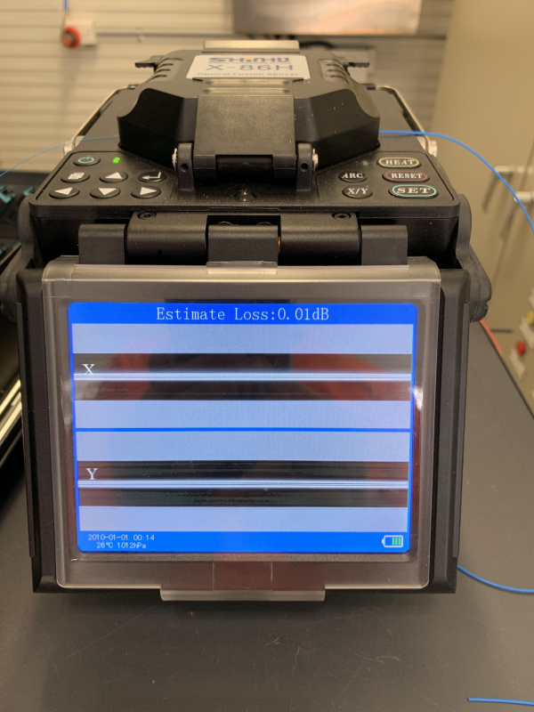 Core alignment fusion splicing, in the image on the right whe have a top and side view of a single 125um Fibre (strand of hair) with a 9um cental glass core (single mode). The two fibres have been aligned inside the machine and fusion spliced (arc welded) together.